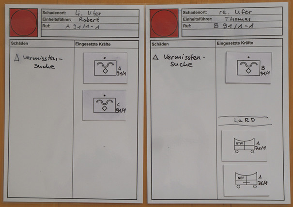 Diese direkte Gegenüberstellung bietet auch einen erheblichen Vorteil bei der Planung. Da wir die einzelnen Maßnahmen sowie die verfügbaren Einheiten gleichzeitig vor Augen haben, können wir schnell ein Defizit oder einen Überschüss an Kräften feststellen. Zudem lässt sich durch das Aufteilen der einzelnen Abschnitte auf die Schadenkonten die Ordnung des Raumes schön erkennen. Das einfache Verschieben zwischen den Tafeln ermöglicht darüber hinaus, den Führungsprozess visuell zu unterstützen. Man muss nur im Hinterkopf behalten, dass man reelle Einheiten verschiebt und dazu weitaus mehr gehört, als "Schachfiguren" auf einem Spielbrett zu verschieben.